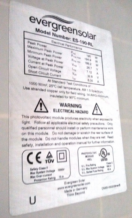Evergreen Solar ES-190-RL / Evergreen ES - 190 - RL / Evergreen ES-190 RL / Evergreen ES 190 RL