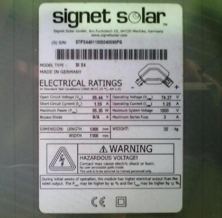 Das Signet Solar SI S4 95p ist ein a-Si Dünnschicht Solarmodul mit 95Wp.