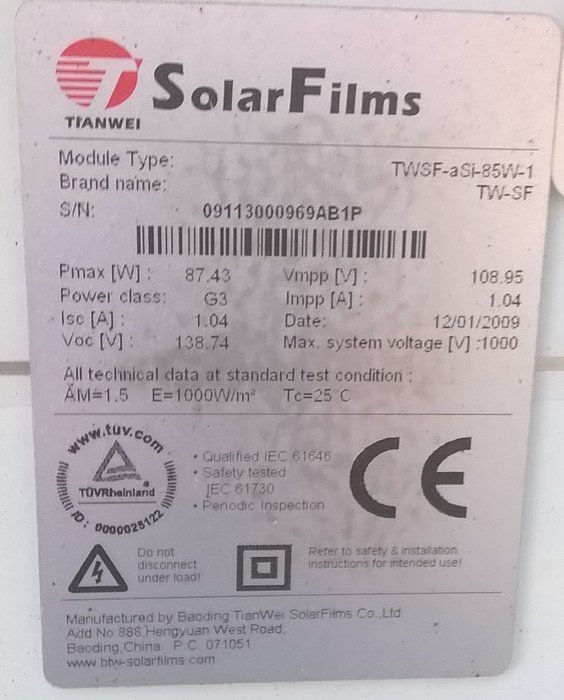 PV-Module / a-Si / Tianwei - TW-SF 85 / 90