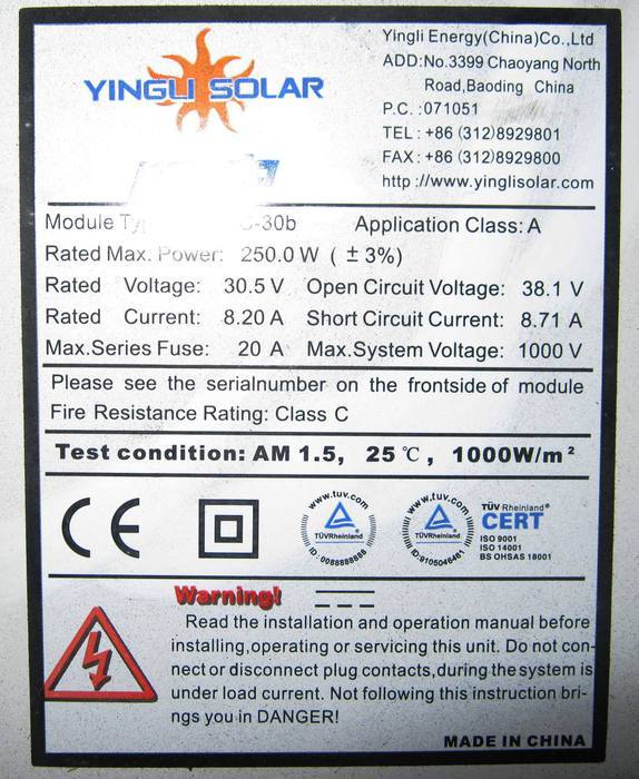 Yingli YL250C-30b  / Yingli YL250C 30b / Yingli YL 250C 30b