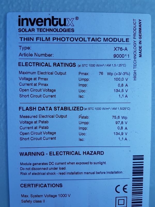 Das Inventux X76-a ist ein a-Si Dünnschicht Solarmodul mit 76Wp.