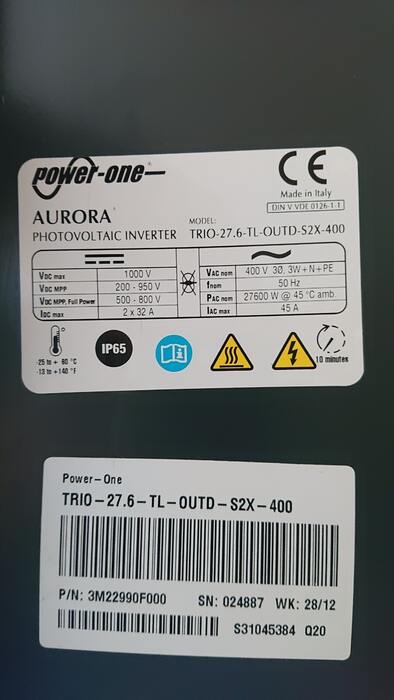 I offer for sale a power-one AURORA TRIO-27.6- TL-OUTD-S2X-400 with the latest firmware uploaded. Inverter is used, but in a perfect condition (mounted indoor) and fully functional.
