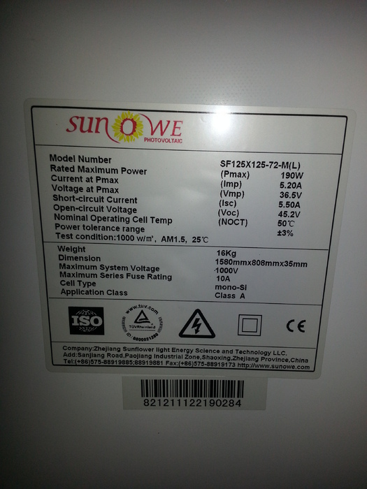 PV-Module / Mono / Sunowe - SF125x125-72-M 190Wp