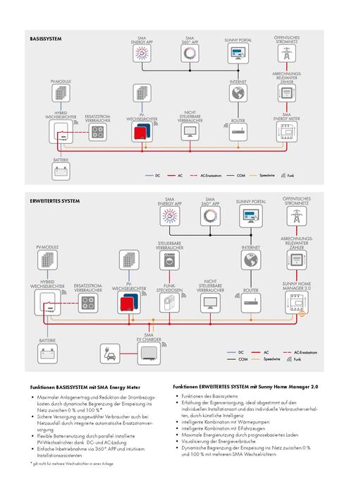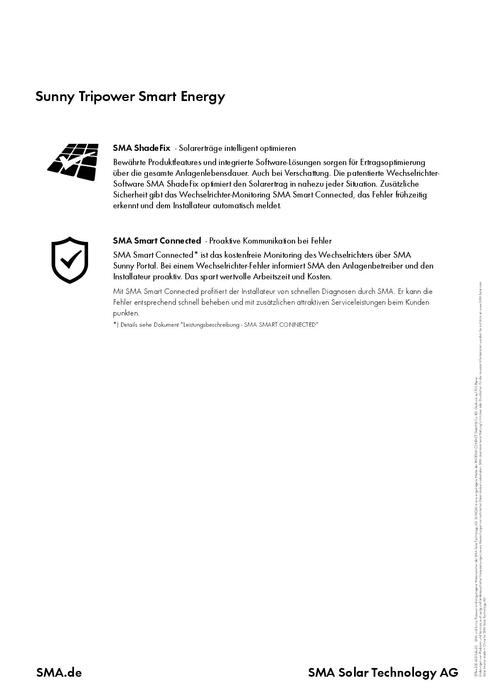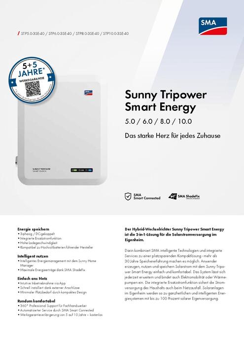 Der Hybrid-Wechselrichter Sunny Tripower Smart Energy ist die 2-in-1-Lösung für die Solarstromversorgung im Eigenheim. Darin kombiniert SMA intelligente Technologien und integrierte Services zu einer platzsparenden Kompaktlösung - mehr als 30 Jahre Speichererfahrung machen es möglich. Anwender erzeugen, nutzen und speichern Solarstrom mit dem Sunny Tripower Smart Energy einfach und komfortabel. Das System lässt sich jederzeit erweitern und bindet auch Elektromobilität oder Wärmepumpen ein. Die integrierte Ersatzstromfunktion sichert die Stromversorgung des Haushalts auch beim Netzausfall. Solaranlagen im Eigenheim werden so zu ganzheitlichen und intelligenten Energiesystemen mit bis zu 100 Prozent solarer Eigenversorgung.