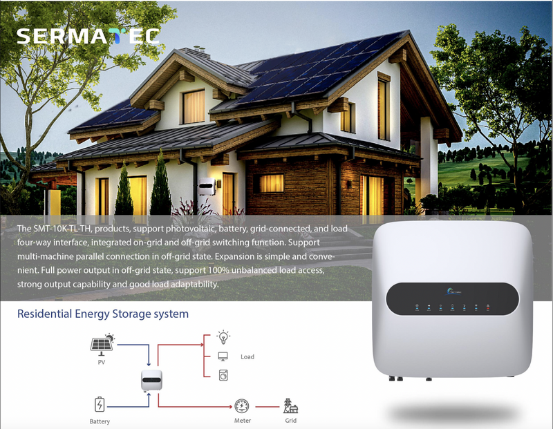 The SMT-10K-TL-TH, products, support photovoltaic, battery, grid-connected, and load four-way interface, integrated on-grid and off-grid switching function. Support multi-machine parallel connection in off-grid state. Expansion is simple a