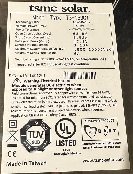 TSMC Solar TS-150C1 CIGS high efficiency Solar Module 150wp
