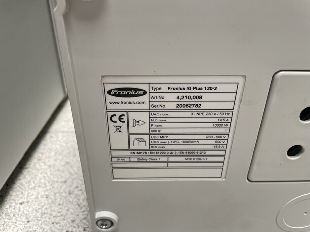 Used inverter 10000W 3-fase works partially. 1 of 3 modules is fried, the other 2 still work. You can use it, it will deliver 2/3th of the power. Can also be sold as parts. Complete with backplat for mounting on the wall
