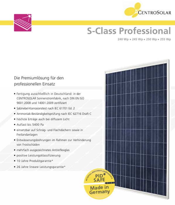 Ich biete 140 gebrauchte Photovoltaik-Module vom Typ Centrosolar S-Class Professional P60 an. Die Module stammen aus einer funktionierenden Anlage, wurden 2024 fachgerecht demontiert und frisch professionell gereinigt.