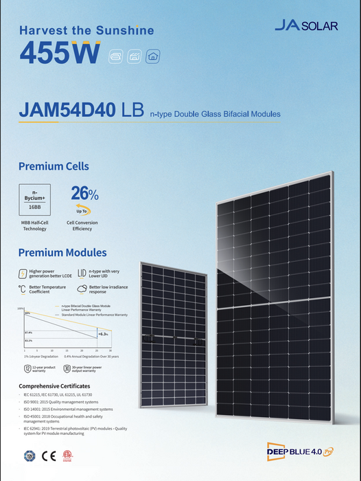 The JA Solar JAM54D40-455/LB Bifacial panel features advanced n-type TOPCon cells and dual-glass construction for superior efficiency and reliability. With up to 455 W power output and bifacial energy gain, it delivers outstanding performance and long-term durability for residential and commercial solar systems.
