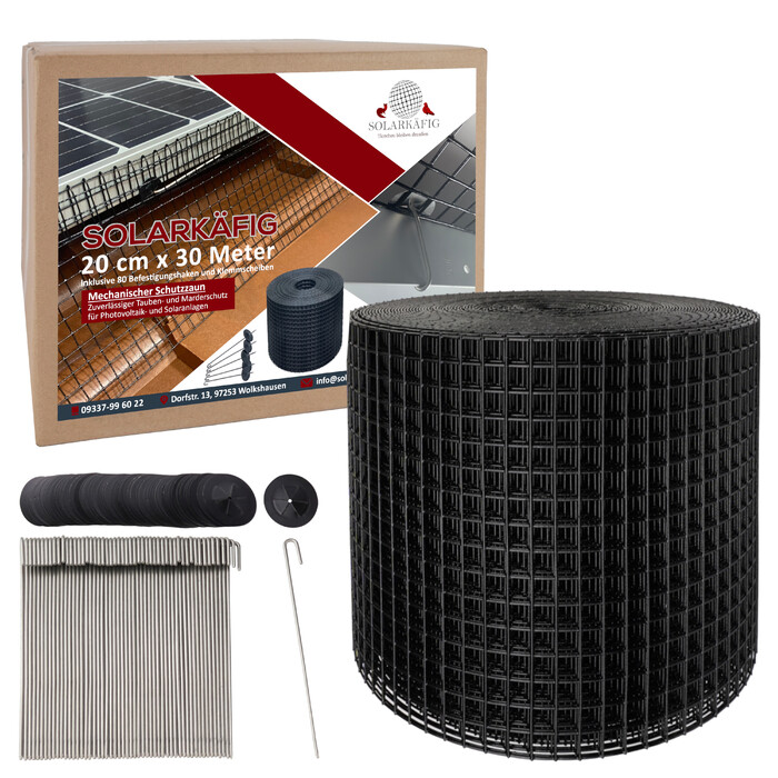 Tauben und Marder unter der PV-Anlage? Schutzzaun aus verzinktem Stahl mit PVC-Beschichtung. Montage ohne Bohren mit C-Klemmen. Komplettse ...