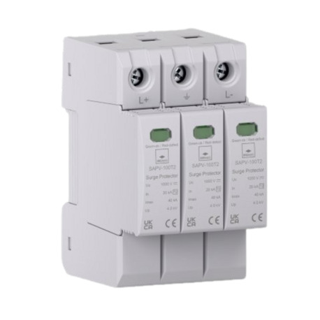 Der SAPV100T2 ist ein DC Überspannungsableiter Typ 2 / Klasse II, speziell entwickelt für Photovoltaik Anwendungen gemäß IEC 61643 31 / EN 50539 11. Er bietet zuverlässigen Schutz vor induzierten Überspannungen im DC Strang und wird typischerweise in String  oder Combiner Boxen sowie im Wechselrichter eingesetzt.