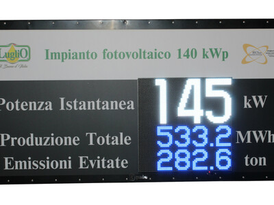 Progettazione e produzione tabelloni LED per la visualizzazione dei dati di produzione degli impianti fotovoltaici.Über Kquadro Elettronica SRL