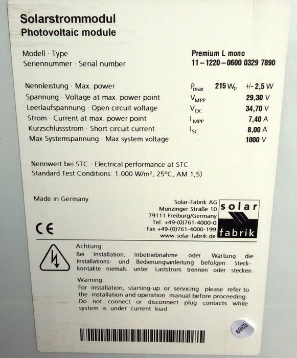 The Solar-Fabrik Premium L is a monocrystalline solar module with 215Wp