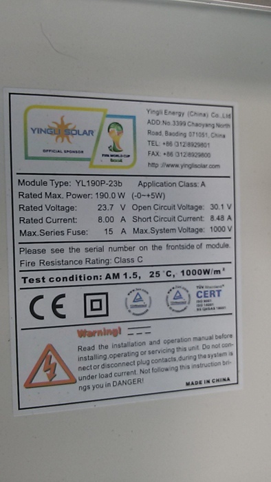 Yingli Solar YL 190P-23b / Yingli Solar YL 190 P - 23 b / Yingli YL190P-23b / Yingli YL190 P 23b
