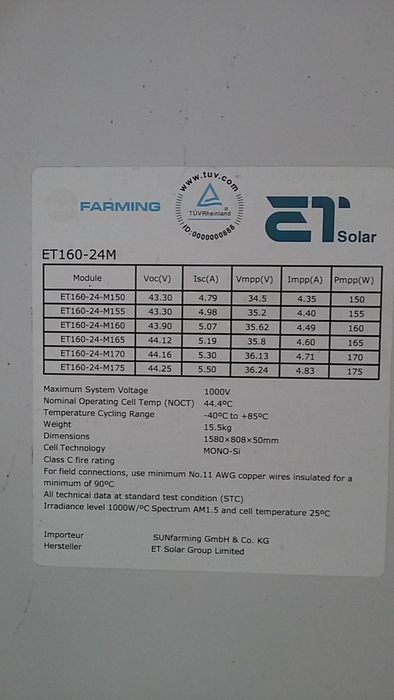 Bei den PV-Modulen handelt es sich um Restposten. Die PV-Module werden ohne Garantie oder Gewährleistung verkauft. Sollten Restgarantien bestehen, können diese eventuell beim Hersteller (sofern dieser nicht insolvent ist) durch den Käufer geltend gemacht werden. Wir weisen ausdrücklich darauf hin, dass wir als Verkäufer keine Gewährleistungsansprüche oder Garantien geben können. Mit der Durchführung Ihres verbindlichen Kaufes erklären Sie sich damit einverstanden!