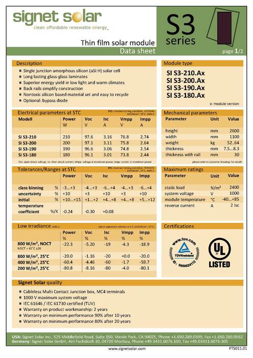 Solar Panel / a-Si / Signet Solar - SI S3-190