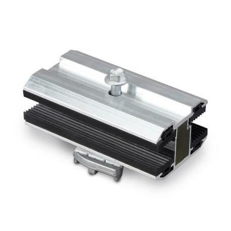 Middle clamp for fastening frameless modules on the C-rail, permissible glass thickness 6.8 - 8.0 mm, completely pre-assembled. Drive clamping screw SW 8.