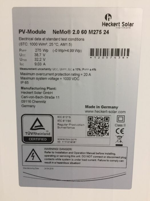 The Heckert NeMo 2.0 60M is a monocrystalline solar module with 275Wp