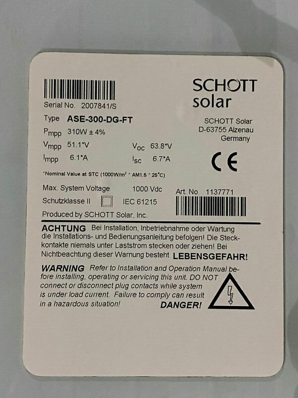 Schott Solar PV Modul ASE-300-DG-FT 1.892 x 1.283 EFG 6.1 A 51.1 V ...