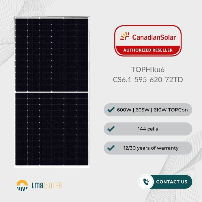 Panel Canadian Solar modelo 6.1-72TD - 610 W Silver Frame, monocristalino TOPCon 144 células (Dual Cell). UNI4, Marco F67, Conectores T6, Cable 1400mm