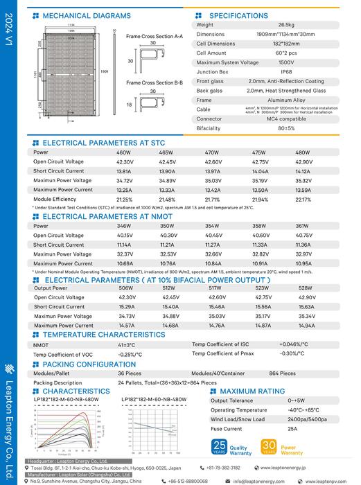 LP182-M-60-NB 480W TOPCon, Dual Glass , Bifacial