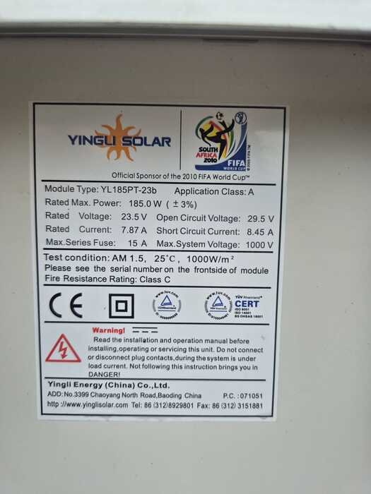 Bei dem PV-Modul handelt es sich um einen gebrauchten Restposten. Das PV-Modul wird ohne Garantie oder Gewährleistung verkauft. Sollten Restgarantien bestehen, können diese eventuell beim Hersteller (sofern dieser nicht insolvent ist) durch den Käufer geltend gemacht werden. Wir weisen ausdrücklich darauf hin, dass wir als Verkäufer keine Gewährleistungsansprüche oder Garantien geben können. Mit der Durchführung Ihres verbindlichen Kaufes erklären Sie sich damit einverstanden!