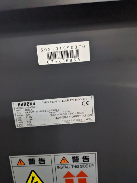 20x Kaneka K60. Dies ist ein gerahmtes Dünnschichtmodul mit 60Wp.