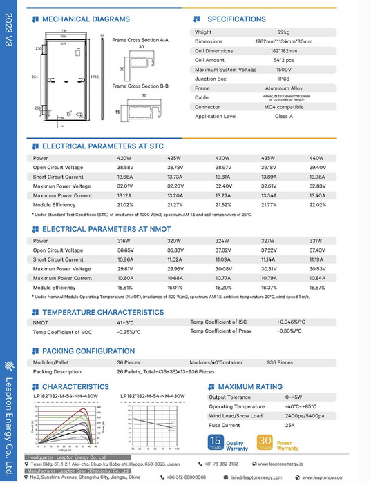430W Leapton N-Type Full Black Black Frame LP182*182-M-54-NH. Photovoltaic mono. 15-year product warranty, 30-year performance warranty, guaranteeing 87.4% efficiency after 30 years.