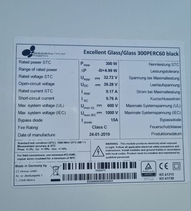 Bei den PV-Modulen handelt es sich um Restposten. Der Verkauf an Unternehmer erfolgt unter Ausschluss jeglicher Sachmängelhaftung. Beim Verkauf an Verbraucher verjähren die gesetzlichen Sachmängelansprüche in einem Jahr ab der Übergabe der Sache. Die Haftung für Schäden aus der Verletzung des Lebens, des Körpers oder der Gesundheit sowie für sonstige Schäden, die auf grob fahrlässiger oder vorsätzlicher Pflichtverletzung beruhen, bleibt unberührt. Wir weisen ausdrücklich darauf hin, dass eine möglicherweise gewährte Herstellergarantie grundsätzlich nur für den Erstkäufer gilt. Einzelheiten bitten wir den diesbezüglichen Angaben des Herstellers zu entnehmen.