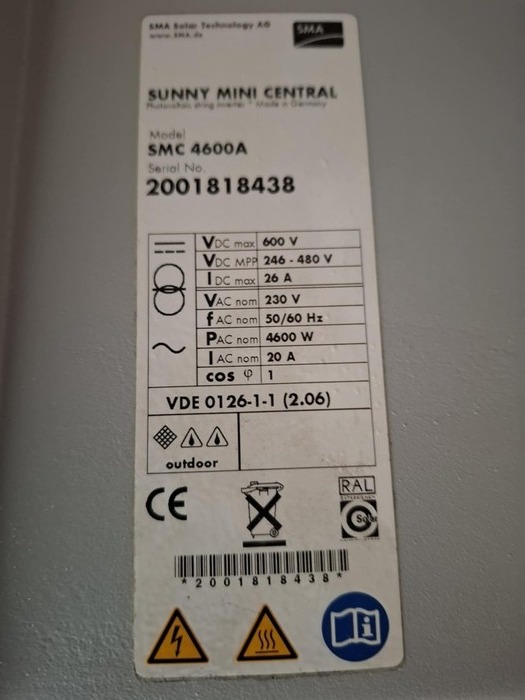 Gebruikte omvormer. SMA - Sunny mini central - SMC 4600A serial number 2001818438