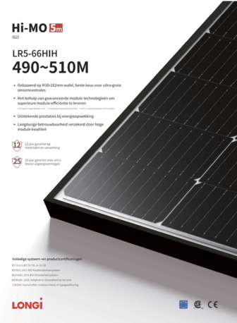 LONGI LR5-66HIH-505M has the following features: Based on M10 wafer, best choice for ultra-large power plants. Advanced module quality delivers excellent module efficiency. Excellent performance in outdoor power generation.