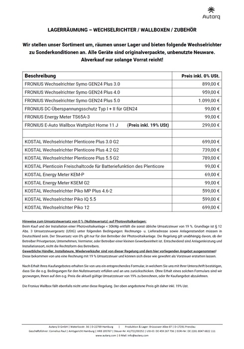 Bitte beachten Sie unsere Hinweise zum Umsatzsteuersatz von 0 % (Nullsteuersatz) auf Photovoltaikanlagen. Dieser gilt nur für Anlagengrößen bis 30kWp unter folgenden Bedingungen: Rechnungs- u. Lieferadresse sowie Anlagenstandort müssen in Deutschland sein. Der Steuersatz von 0% gilt nur für den Betreiber der Photovoltaikanlage, nicht für Händler oder Installateure.