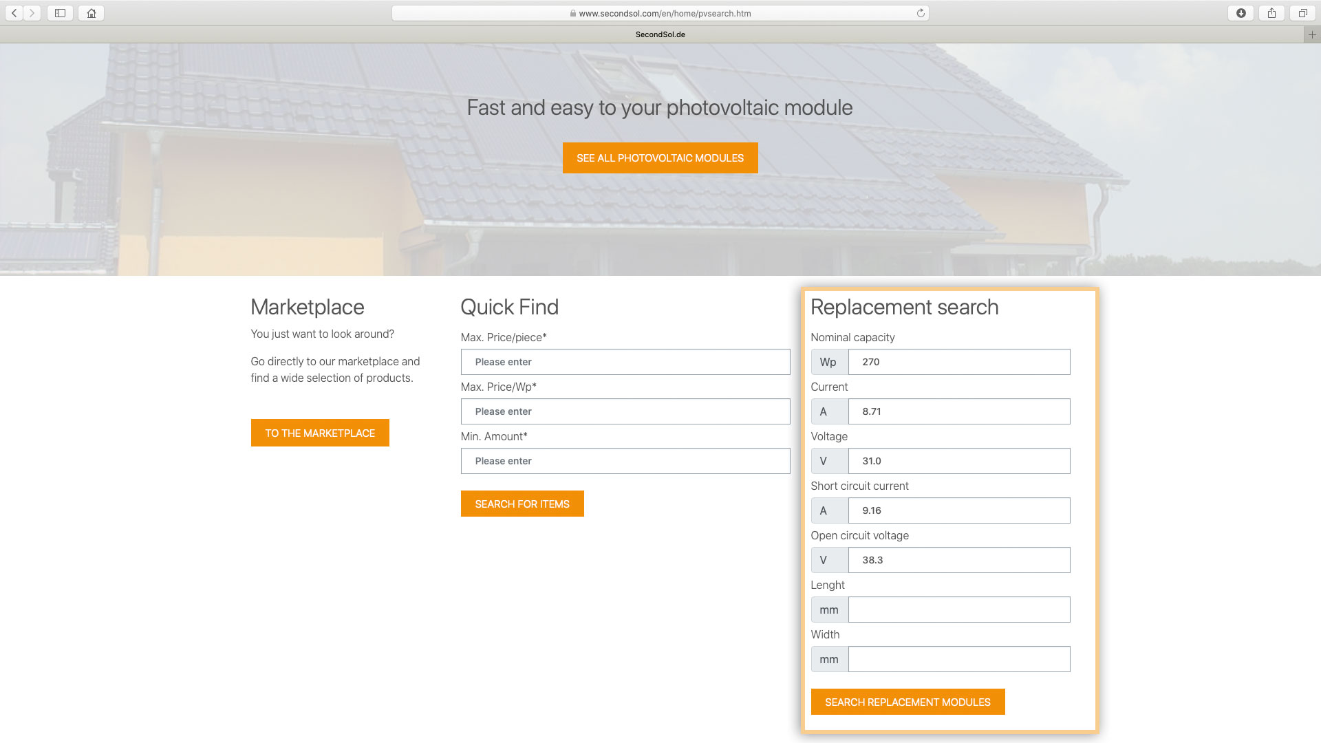 Put the data from the data sheet or label into our search engine. For the time being, leave out the length and width of the modules.