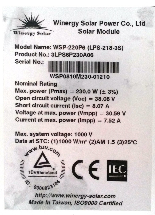 Moduli FV / Poli / Winergy Solar - WSP-220P6 230Wp