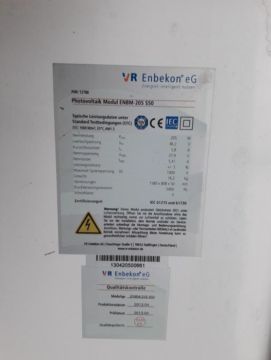 Si tratta di moduli FV utilizzati che sono stati controllati, puliti e sottoposti a flashing in un centro di prova certificato. Alcuni dei diodi di bypass sono stati sostituiti. I moduli FV vengono ordinati per un massimo di circa Meno 5%.