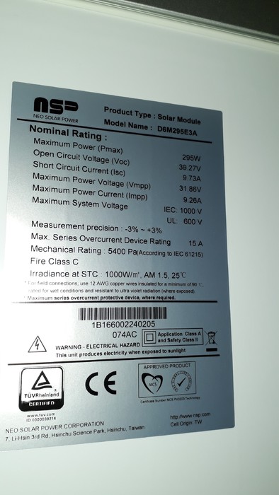 The solar panels Neo Solar NSP D6M295E3A are monocristalline panels with 295Wp.