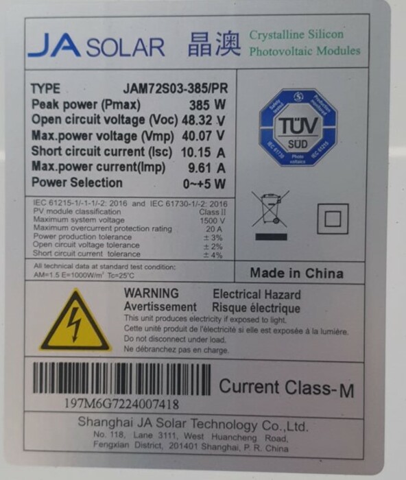 Tipo JaSolar JAM72S03-385/PR 385Wp