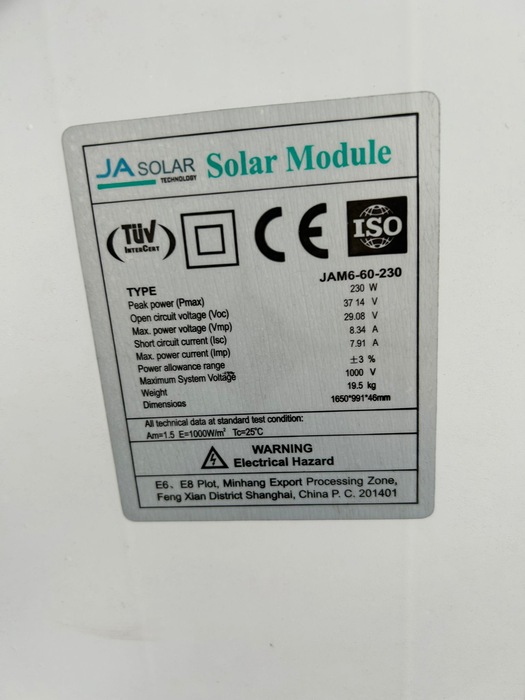 Trina Solar Manufacturer: Trina Solar Type: TSM-250PC05A Wattage: 250 watts Cell Type: Polycrystalline No-load current / open circuit voltage (Voc) Target value: 38.3 volts No-load current / Open Circuit Voltage (Voc) actual value: 35.3-37.8 volt