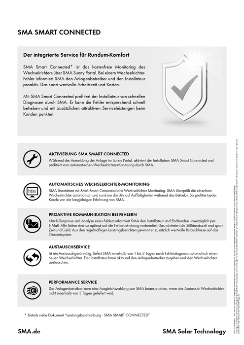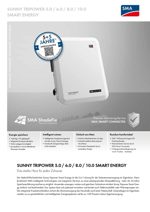 Fachhandwerker können auf den 360° Professional Support zurückgreifen, während das SMA Smart Connected automatisches Wechselrichter-Monitoring ermöglicht. Das Sunny Tripower Smart Energy ist durch seine hohe Qualität mit 10 Jahren Garantie ausgestattet.