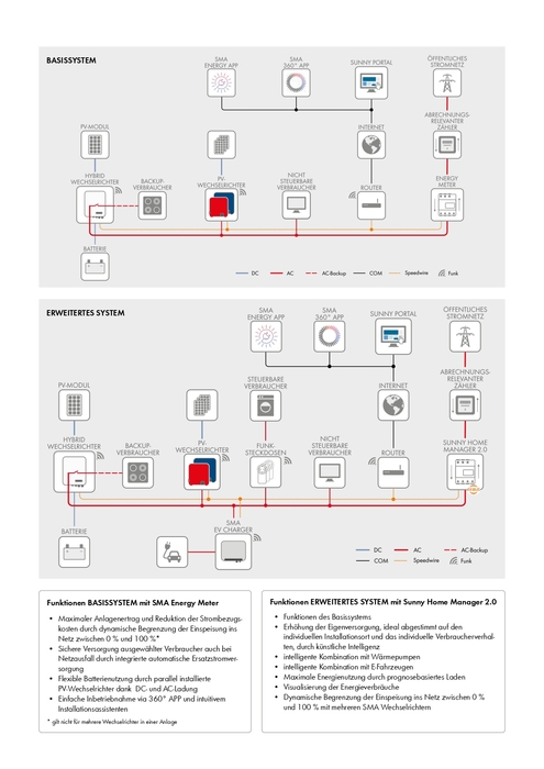 Das System kann erweitert werden und ist auch an Elektromobilität oder Wärmepumpen angeschlossen. Eine integrierte Ersatzstromfunktion sichert die Stromversorgung im Falle eines Netzausfalls. Die Anlage wird zu einem ganzheitlichen und intelligenten Energiesystem mit bis zu 100 Prozent solarer Eigenversorgung. Weitere Vorteile sind die Möglichkeit zur Energiespeicherung, die hohe Ladegeschwindigkeit, die Kompatibilität zu Hochvoltbatterien führender Hersteller, intelligentes Energiemanagement mit dem Sunny Home Manager und maximaler Energieertrag dank SMA ShadeFix. Eine intuitive Inbetriebnahme und schnelle Installation durch externe Anschlüsse sowie ein kompaktes Design machen das System rundum komfortabel.