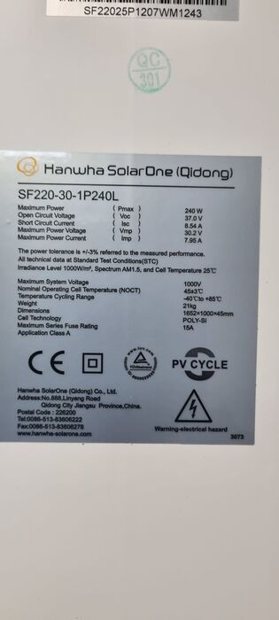 Das Hanwha SF220-30-1P240L ist ein polykristallines Solarmodul mit 240Wp.