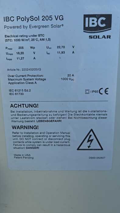 Bei dem PV-Modul handelt es sich um einen gebrauchten Restposten. Das PV-Modul wird ohne Garantie oder Gewährleistung verkauft. Sollten Restgarantien bestehen, können diese eventuell beim Hersteller (sofern dieser nicht insolvent ist) durch den Käufer geltend gemacht werden. Wir weisen ausdrücklich darauf hin, dass wir als Verkäufer keine Gewährleistungsansprüche oder Garantien geben können. Mit der Durchführung Ihres verbindlichen Kaufes erklären Sie sich damit einverstanden!