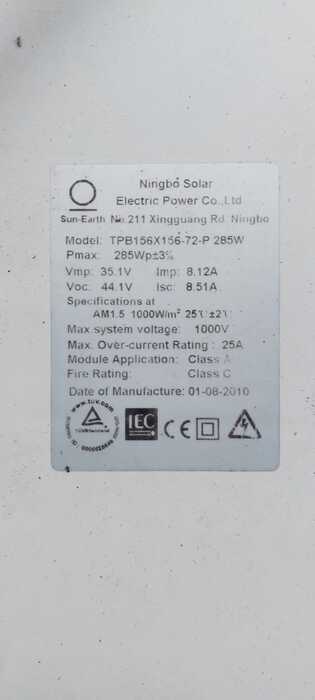 SUN-EARTH, NINGBO SOLAR TPB156X156-72-P , 285 WATT