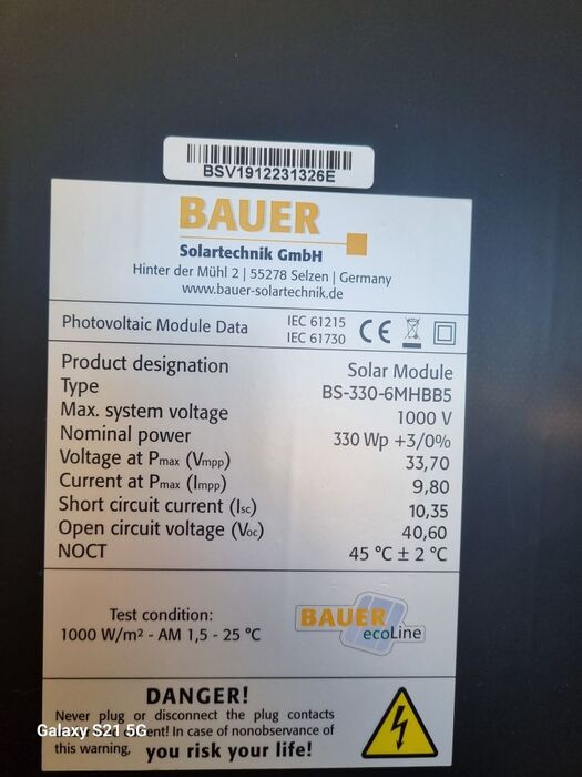 Das Bauer Solar BS-330-6MHBB5 ist ein monokristallines Modul mit 330Wp.