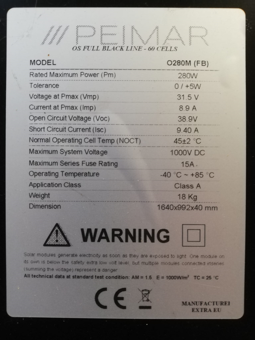PEIMAR O280M(FB) PANNELLO FOTOVOLTAICO MONOCRISTALLINO 280W