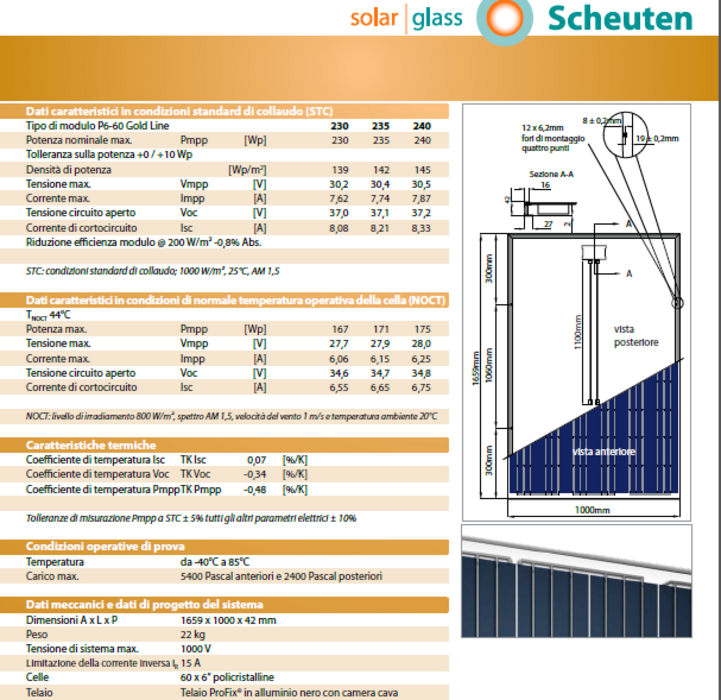 - N} 13 pannelli solari Scheuten Solar Multisol P6-60 Gold line - in Silicio Policr. 240 Wp cadauno - vedi sch.tecnica