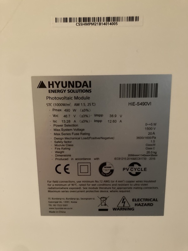 Lotto composto da 9 Moduli fotovoltaici Hyundai HIE-S490VI, mai utilizzati, montati per 3 mesi e poi smontati perché non delle corretta m ...