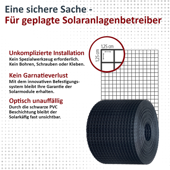 • Zuverlässige Marderabwehr: Marder richten durch Kabelverbiss an Photovoltaikanlagen erhebliche Schäden an. Das engmaschige Gitter schützt zuverlässig vor Marderschäden an Kabeln und Verbindungsstellen.