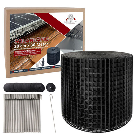 Tauben oder Marder unter Solarmodulen sind einer der häufigsten Gründe für Leistungsverluste und Kabelschäden an Photovoltaikanlagen. Der Solarkäfig 20cm Verzinkt ist das meistgewählte Modell für die Taubenabwehr an Solaranlagen: Das Standardmaß von 20cm passt an viele der in Deutschland installierten Solarmodule. Ob 30 Meter für Ihre komplette Solaranlage reichen, hängt von ihrer Größe ab. Berechnen Sie den Umfang Ihrer Modulreihen vorab, um den genauen Bedarf zu ermitteln. Als zuverlässige Schädlingsabwehr schützt er Module und Dacheindeckungen vor Tauben, Mardern und anderen Schädlingen. Als Alternative empfehlen wir auch unsere Edelstahl-Variante.