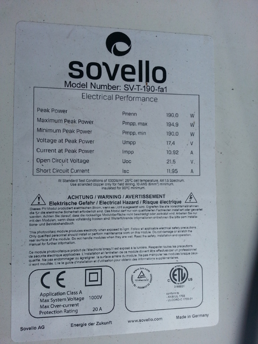 Sovello SV-T-190-FA1 è un modulo solare policristallino con 190Wp